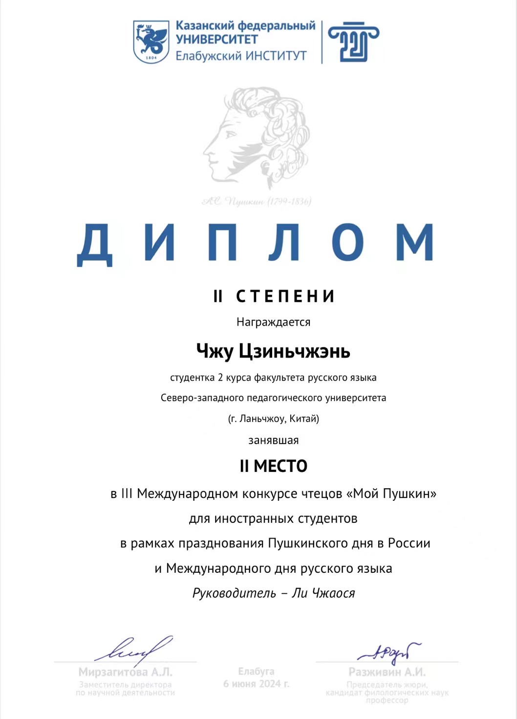 2024年6月,俄语系组织学生参加喀山大学叶拉布加学院的第三届《普希金》诗歌朗诵比赛,此次比赛是在庆祝国际俄语日和普希金日的框架下举行的赛事。 俄语系教师李莉、李朝霞、武婷担任指导教师,组织学生录制比赛视频。最终,俄语系2023级学生罗相宇、谢雨辰、马云峰、王甜、石欣婷,2022级学生朱金桢荣获二等奖,2021级学生李梦瑶荣获三等奖。