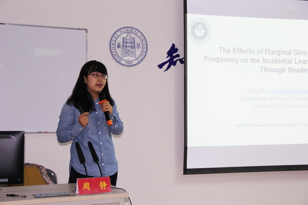 4月12日下午4点三十分,在3号教学楼806教室,新葡的京官网青年教师周静、美国夏威夷大学在读博士,应邀为新葡的京官网研究生作了题为《The Effects of Marginal Glossing and Word Frequency on the Incidental Learning of Vocabulary through Reading》的学术报告。由高育松副院长主持,新葡的京官网100多位一年级研究生和部分教师参加了此次报告。