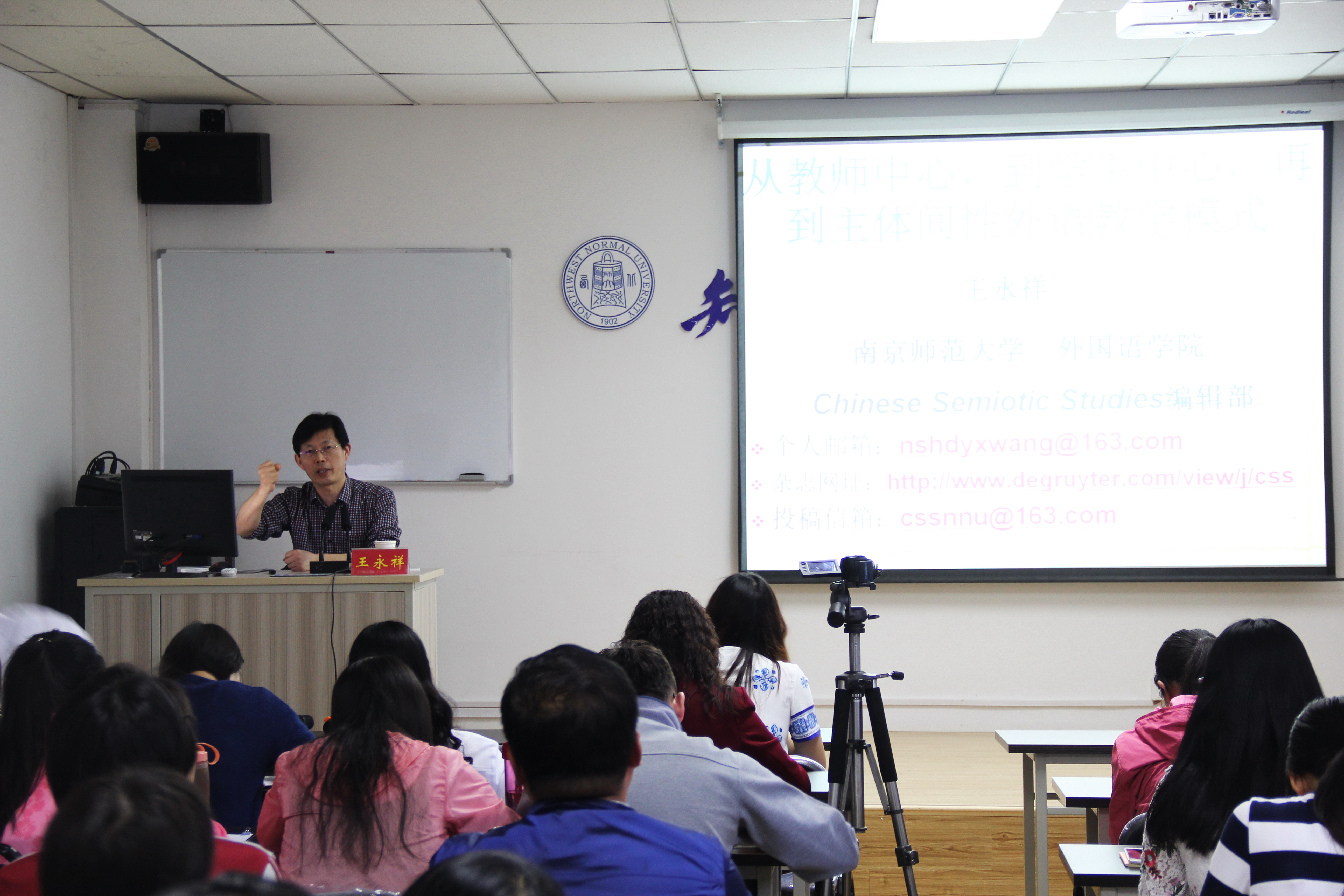 报告会上,王教授首先介绍了Chinese Semiotic Studies曲折的创刊历史,并欢迎西北师大的各位师生积极投稿。其次,他从福柯在《规训与惩罚》一书中对边沁的全景敞视建筑引出“以教师为中心”的教学模式大行其道是由种种来自课堂话语背后的权力导致的。教师为中心的教学结构能在几百年间岿然不动,是因为赫尔巴特,凯洛夫,赞可夫, 巴班斯基,布鲁纳,布鲁姆,加涅,奥苏伯尔等人的研究和行为主义学习理论等对以教师为中心的教学结构给予了深厚的教学理论和学习理论基础。同样,“以学生为中心”的教学思想和教学模式的研究盛行是因为其众多理论的支撑:我国伟大的思想家和教育家孔子提出的“不愤不启,不悱不发”;西方古希腊的雅典和谐教育;发端于14–16世纪意大利文艺复兴时期的“人本主义”思潮;强调学习的个人意义的认知心理学中的建构主义(皮亚杰等人为代表)。接着,王永祥教授从教师与学生之间的交互关系谈论了教师中心与学生中心的利弊,这两种教学模式各有利弊,因此主体间性外语教学模式应运而生。王教授从二元对立走向多元融合、多元共生,强势话语的弱势化与弱势话语的强势化,“中心”的消解、动态的平衡三个方面分析了建立主体间性外语教学模式的必要性。主体间性教学模式,就是:由教师主导的、由多交互主体协同参与的、平等对话的、多元融合的和动态多变的课堂模式。第一,教师主导;第二,多交互主体协同参与;第三,平等对话;第四,多元融合;第五,动态多变。最后,王教授指出唯有主体间性能够让外语课堂返璞归真。唯有对话能够从根本上进行外语教学改革。主体间性外语教学模式的实施将是一项长期的系统工程,需要几代人的努力。报告之后,高院长做了精彩的点评。