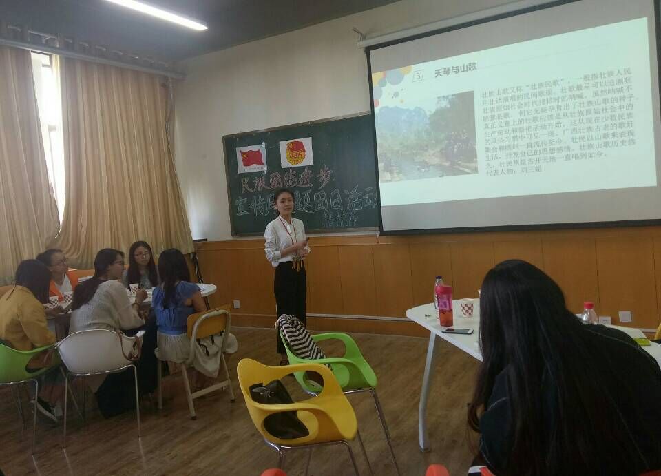 首先马老师给大家做了民族形势专题的报告,介绍了国家为保障各少数民族权益而制定的一系列政策和战略,同时,希望我们尊重各民族风俗习惯,以平常的心态去了解各民族文化,并与少数民族同学保持正常的交往关系,让我们有一个和谐、多文化的校园环境。之后蒙古族、东乡族、彝族、回族、维吾尔族、裕固族、土族、壮族等民族的同学们用歌唱、ppt等形式向大家展示了本民族风情并朗诵了优秀主题征文片段,呼吁大家积极了解各民族文化,使民族交流更和谐,民族融合更充分。同学们在对题为“对少数民族的刻板印象”的话题进行讨论并发表各自意见后,观看了2015年新葡的京集团35222vip迎新晚会“民族大联欢”部分与电影《乌鲁木齐的天空》。最后柴书记总结道,我们要心中有爱,让这爱充满世界。不同民族之间也要做到四个认同: 认同伟大祖国,认同中华民族大家庭,认同中华文化,认同中国社会主义道路。