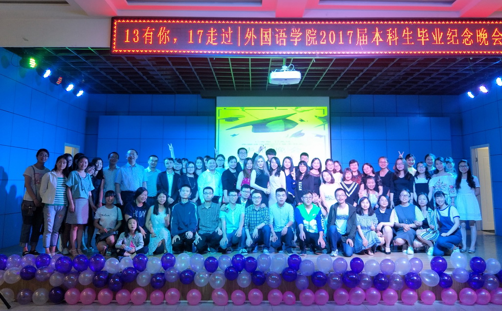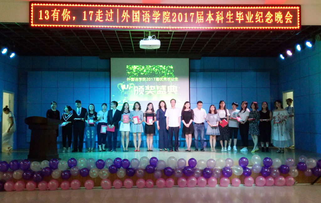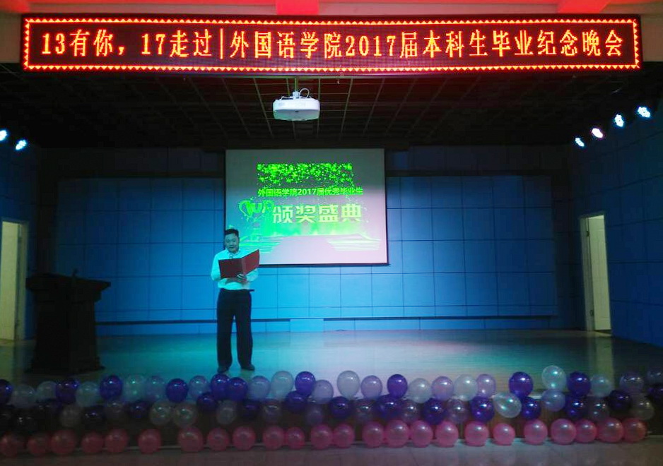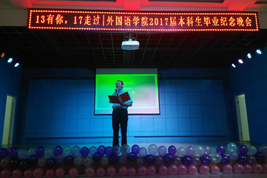 2017年6月6日晚,一场主题为“13有你,17走过”的毕业晚会在我校学生发展中心四楼多功能厅举办。学院领导、各系系主任、毕业班班主任及2017届毕业生300余人参加了本场晚会。晚会由2013级英语5班毕业生王亚妮和鲁天阳同学主持。