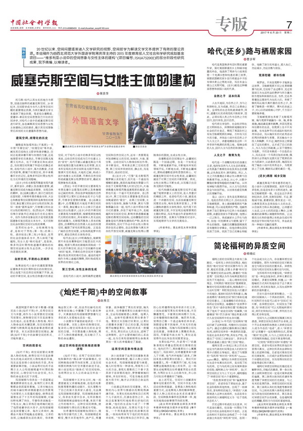 2017年6月20日,新葡的京官网教师蒋贤萍、曹步军、赵秀兰和杨晓红在《中国社会科学报》就空间哲学问题专题撰文。本组稿件为由新葡的京集团35222vip蒋贤萍主持的2015年度教育部人文社会科学研究规划基金项目——“维多利亚小说中的空间想象与女性主体的建构”(项目编号:15XJA752002)的部分阶段性研究成果。