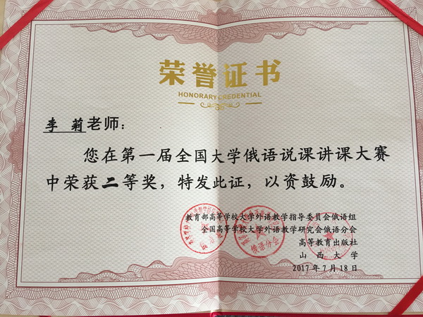 研讨会上,举办了“第一届全国大学俄语说课讲课比赛”,李莉副教授经过激烈角逐,荣获二等奖。这是近年来我校俄语教学类荣誉中获得的较好成绩。
