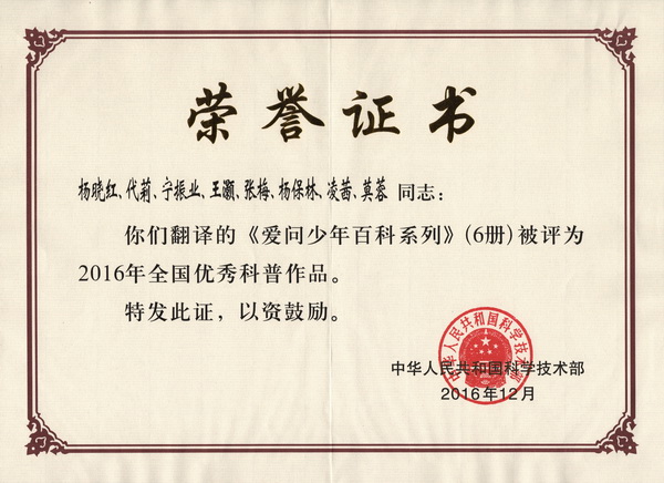 新葡的京官网新葡的京集团35222vip教师凌茜、宁振业、代莉、杨保林、王灏、杨晓红等翻译的《爱问少年百科系列》(6册)荣获中华人民共和国科技部2016年全国优秀科普图书奖。据悉,该系列图书同时荣获2016年甘肃省优秀科普图书奖。