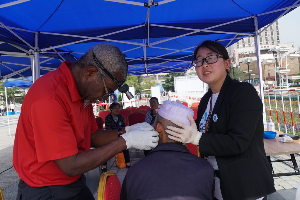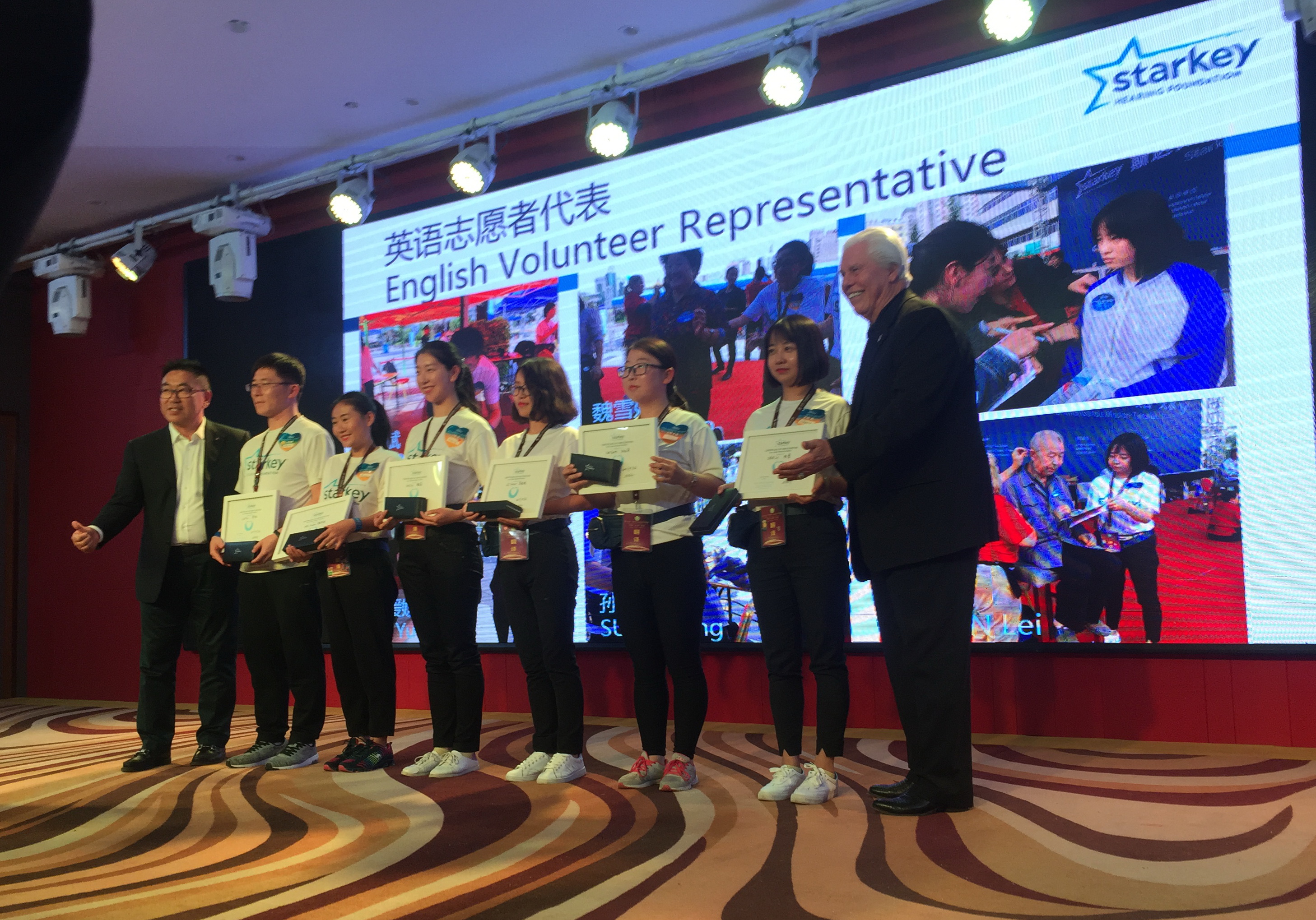 同志愿者并肩作战的还有来自美国、英国、加拿大、柬埔寨、菲律宾、哥伦比亚等多个国家的30多名听力专家,他们以饱满的工作热情和严谨的工作态度耐心细致地为每一位患者进行一对一调试验配。此外,斯达克基金会创始人比尔·奥斯汀先生也亲临现场,他无私奉献的精神也感染着我们每一位志愿者。他说道:As we touch one person we touch the family, wetouch the community, we touch the world. (我们帮助了一个人就是帮助了一个家庭,帮助了这个家庭就是帮助了这个社区,帮助了每一个社区就是在帮助整个社会乃至全世界。)