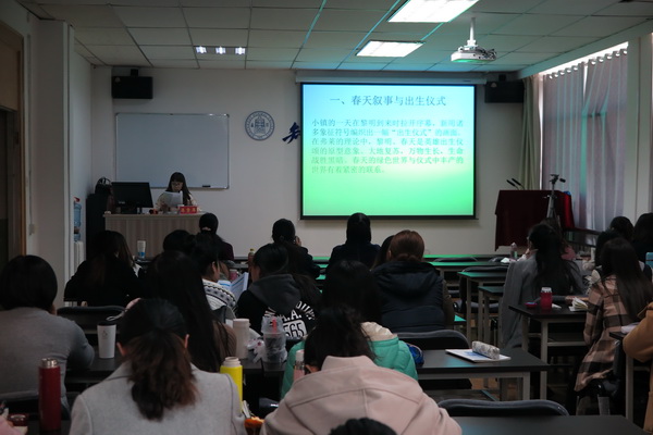 讲座中,蒋贤萍副教授首先介绍了自己的创作灵感及写作背景,以此开场吸引学生们的注意力。其次,向大家介绍了《小镇》的创作背景及思路。蒋教授指出,该剧作是一场盛大的生命仪式的展演,再现了出生,结婚与死亡等典型的生命阈限阶段。接着,蒋贤萍副教授围绕春天叙事与出生仪式,夏天叙事与结婚仪式,秋天叙事与死亡仪式,冬天叙事与复活仪式详细阐述了《小镇》带给我们的神秘而神圣的仪式感,向我们揭示了生命存在的原初意义,并告诫我们要珍惜生命中的每一分每一秒。