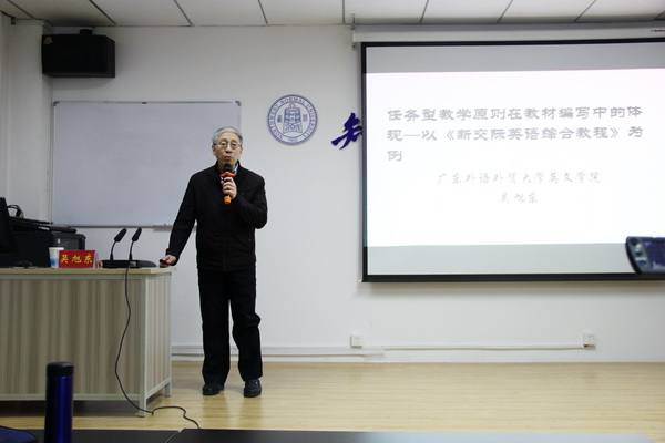 报告会上,吴旭东教授从四个方面深入浅出的分析了任务型教学原则在教材编写中的具体体现。第一,吴旭东教授就自己的理解具体的阐释了任务型教学原则的内容,其中包括外语学习目标对教学的启示、任务型教学的特点以及任务型教学课堂与传统外语课堂之间的差异。第二,吴旭东教授讲解了自己编写教材的理论模式。首先他谈到了在教材编写过程中遇到的难题,并且在教材编写过程中模式的建立,由此他提出了五个任务设计问题并做出相应的解答。第三,吴旭东教授说到了使用这部教材的操作要点,即说服学生认同教材的编写理念,并且教师要根据自己学生的情况对教授内容作相应的调整。最后,吴旭东教授为大家展示了一个单元的任务设计,通过具体的例子,深刻的说明了任务型教学的作用。