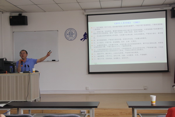 紧接着,曹进院长为志愿者们进行了外事纪律的培训。曹院长从志愿者的涉外礼仪作为切入点,以自己丰富的亲身实践经历和全面专业的志愿服务知识教授同学们用科学、安全、高效的方法服务此次志愿活动。同时,强调了遵守纪律是外事服务的第一要素,在外事服务中要注意自己的人身安全和交通安全等。另外,在进行志愿服务时要及时反馈自己的情况、位置等信息,严防意外事故的发生。最后,曹进院长要求全体志愿者在活动要严格要求自己,绝对服从带队老师的安排,作为新时代青年志愿者要有吃苦耐劳、坚毅负责的品质。