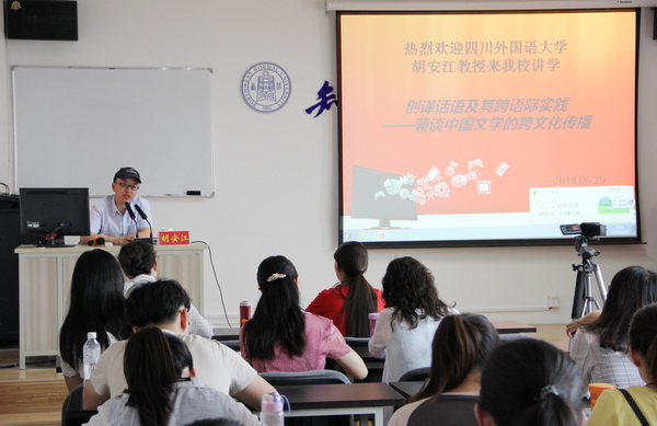 2018年6月29日,应学院邀请,四川外国语大学博士生导师胡安江教授在教学3号楼806教室作了题为“创译话语及其语际实践—兼谈中国文学的跨文化传播”的学术讲座。本次讲座由副院长俞婷教授主持,学院教师及研究生一百余人聆听了此次报告。 胡教授首先对博尔赫斯对加朗所译的《一千一零夜》的评价向在场师生做了介绍。胡教授指出,加朗的译文在传统的翻译批评家眼中是叛逆的,不忠实的,但却吸引了全世界广泛的阅读兴趣,具有深远的文学价值;而所谓的“创译”话语翻译实践,在充分考虑译入语的文化背景下,更能凸显对译入语读者的亲和力。随后,胡教授指出,传统的翻译批评只局限在“二元对立”的判断上,而忽视了描述与分析对翻译这门学科的重要意义。最后,胡教授对在座翻译专业研究生提出了翻译学习的诸多宝贵意见。胡教授深入浅出的讲演,不时赢得在场师生的阵阵掌声。