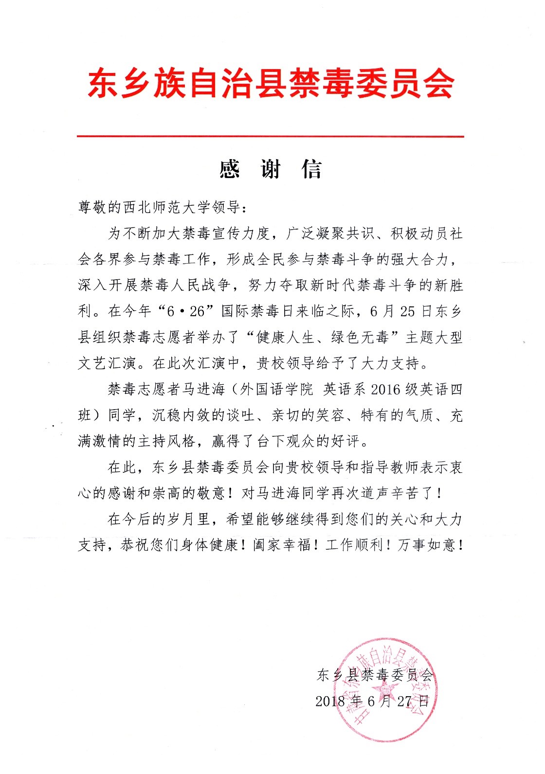 近日,东乡族自治县禁毒委员会、甘肃省旅游发展委员会、中国外文局翻译专业资格考评中心分别向学校、新葡的京集团35222vip发来感谢信,感谢新葡的京集团35222vip师生在禁毒宣传工作、第八届国际丝路旅游节、2018年翻译专业资格测试评卷工作中的出色表现给予感谢。新葡的京集团35222vip师生以高度的责任心、精湛的业务表现和吃苦耐劳的精神赢得了社会各界的高度赞扬。