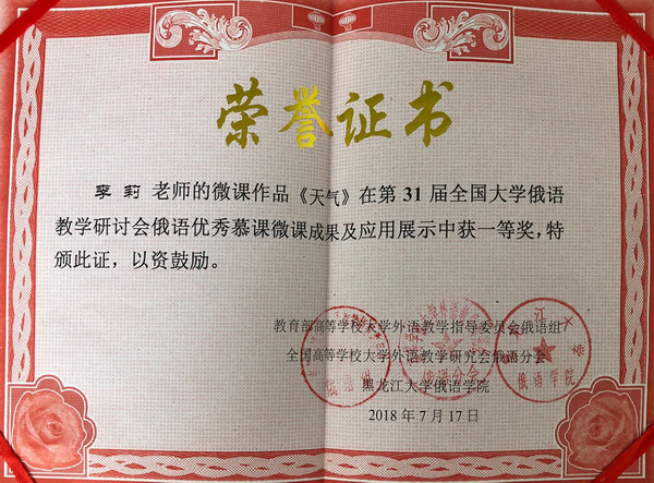 李莉老师在大赛中提交的微课《天气》荣获一等奖。这是新葡的京官网俄语系教师近年来参赛作品中获得的最高级别的奖励。