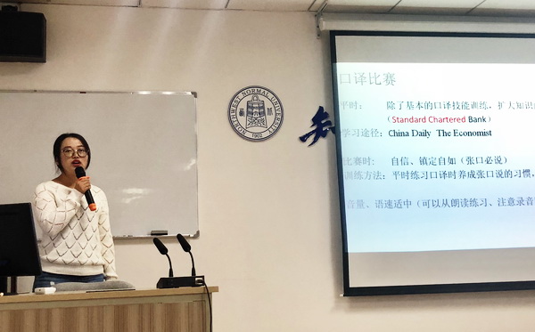 第七届全国口译大赛西北赛区冠军、2016级翻译硕士刘静分享了她学习口译的方法与心得。通过自己多次口译大赛及实践经验,总结了自己平时的学习方法、学习途径、训练方法等,还跟同学们分享了参加比赛时的要领,分析了不同类型的口译大赛之间存在的差别。2017级翻译硕士郑彤,向大家分享了自己在“第二届许源冲翻译大赛”中获奖的经验心得,总结了世上无难事,只怕有心人的成功秘诀,认为认真学习是必要前提;博而有专是作为翻译硕士必备的技能;不断学习、反思是成功的关键所在。2017级翻译硕士冯秦分享了自己丰富的实践经历,总结了自己在多个领域中尝试之后与翻译相结合的心得体会,还向大家分享了宝贵的学习和实践资源,强调了今后对于职业面试所需要做的准备,并就翻译硕士职业发展提出了中肯的建议。
