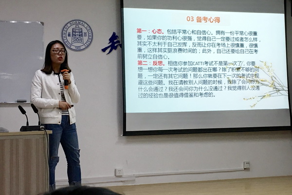 2016级翻译硕士张晓琴、2017级翻译硕士瞿静分享了她们备考CATTI三级和二级的经验和心得,包括很多实用网站、书目、学习方法以及考试相关注意事项,并且全面地总结了考试通过的秘诀:25%持之以恒+25%理论结合实践+25%真题、专有名词+25%好友督促、交流。