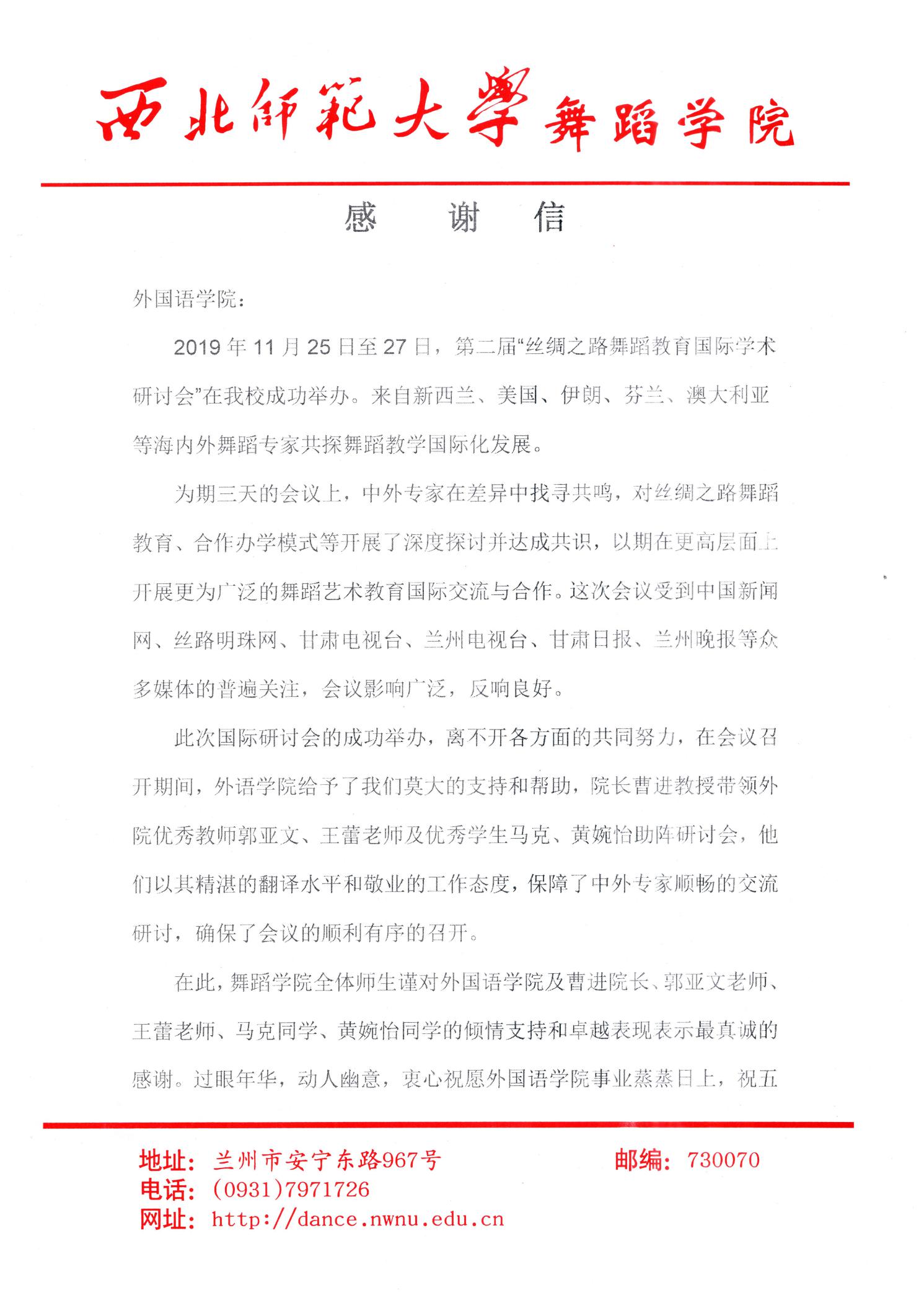 2019年11月25日-27日,第二届“丝绸之路舞蹈教育国际学术研讨会”在我校成功举办。来自新西兰、美国、伊朗、芬兰 、澳大利亚等海内外舞蹈专家共探舞蹈教学国际化发展。为期三天的会议上,中外专家在差异中找寻共鸣,对丝绸之路舞蹈教育、合作办学模式等开展了深度探讨并达成共识,以期在更高层面上开展更为广泛的舞蹈艺术教育国际交流与合作。