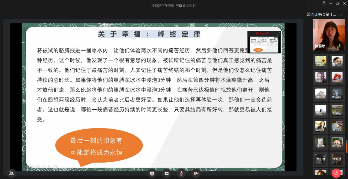 人间四月,桃李芬芳,如约而至的不仅草长莺飞的春天,还有书香致远的世界读书日。在第二十五个世界读书日来临之际,新葡的京集团35222vip以“益周读书”系列读书会第十八讲特此献礼。本次读书会邀请了新葡的京集团35222vip钟莉婷老师进行在线读译分享——《思维的发现:关于决策与判断的科学》。同时,学院院长曹进也跟同学们进行了在线分享。