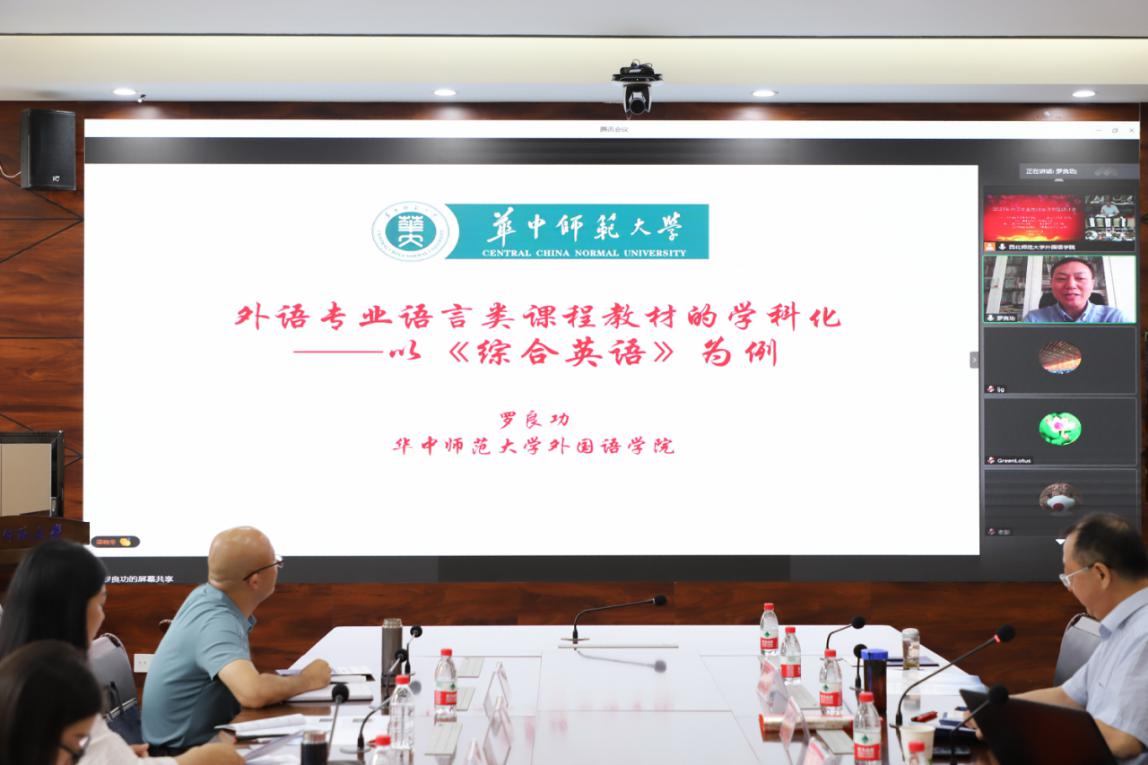 在为期一天的研讨会上,15名国内知名外语专家和学科负责人作了精彩的学术报告,包括教育部高等学校英语教学指导委员会秘书长、湖南师范大学新葡的京集团35222vip院长曾艳钰教授,北京师范大学新葡的京集团35222vip程晓堂教授,西南大学新葡的京集团35222vip院长文旭教授,东北师范大学新葡的京集团35222vip院长林正军教授,华中师范大学新葡的京集团35222vip院长罗良功教授,华东师范大学新葡的京集团35222vip副院长杨延宁教授,以及王永祥教授、王卓教授、朱小琳教授、王松林教授、潘震教授、刘国兵教授、方幸福教授等不同高校的外语学科负责人。大家就外语专业教材建设存在的问题与对策、课程思政在外语专业教材建设中的落实、外语专业教材建设的学科化、全球治理人才培养对外语专业教材建设提出的新要求、外语教材建设中的家国情怀培养等问题进行了深入的探讨。新葡的京官网院长曹进教授、副院长俞婷教授也在研讨会上做了主旨发言,分别探讨了外语专业教学与教材建设的一体融合问题与教材编写中的选材问题。