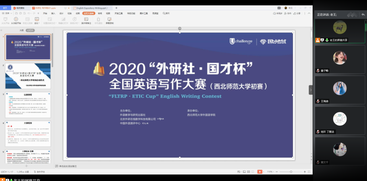 2020年8月6号星期四下午14:30-15:30,新葡的京集团35222vip英语系举办了2020年“外研社·国才杯”演讲、写作、阅读比赛暑期线上第一期培训。各学院写作比赛报名选手,共100名同学参加培训。