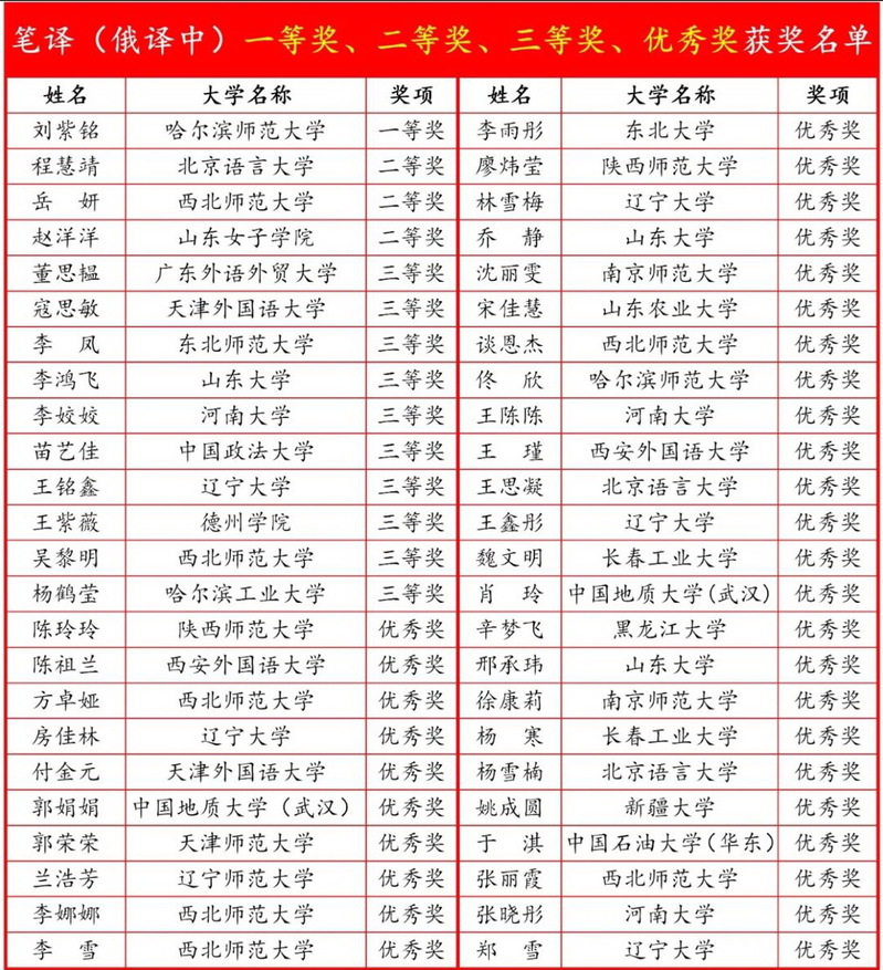 本次大赛由评审委员会组织128位专家共进行了三轮匿名评审,线上初评、复评和现场专家笔译总评,程序严格合规。笔译(俄译中)设一等奖1名,二等奖3名,三等奖10名,优秀奖若干。此次大赛旨在传播中国文化,传递中国声音,达到以赛促学、以训促学的目的。俄语系参赛学生在学院领导的大力支持和专业老师的悉心指导下,凭借扎实的语言基础、出色的俄汉双语转换能力与笔译技巧在此次比赛中取得了良好的成绩。
