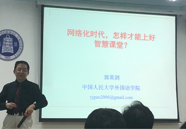 9月18日下午3点至6点,在教学3号楼709教室,郭英剑教授以“网络化时代,怎样才能上好智慧课堂?”为题,分析、阐述了技术发展带来的教学方法变革、英美文化教学的困境与出路,以及教师应如何具备国际化视野、批判性思维能力、跨文化交际能力和强烈的社会责任感等重要问题。郭教授指出,网络化时代的外语教师要成为知识与文化的传播者,不仅要教授知识以增加学生的知识储备,更要学会利用网络化工具来增加学生的智慧和阅历。