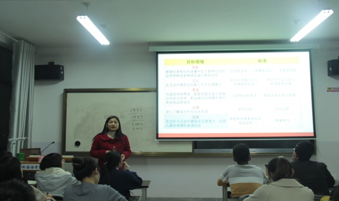 讲座伊始,俞婷教授结合我国在国际社会上倡导的人类命运共同体、一带一路、文化自信以及中国文化“走出去”的新时代和新使命,向大家阐释了全球化、信息化和多元化背景下,培养适应社会文化环境,服务于国家、社会和个人发展的跨文化人才的重要性。接着,俞婷教授详细讲述了中国课程标准和美国学习标准的不同历史背景及发展演变过程。在对二者的异同点进行比较之后,俞婷教授对外语教学方法的总体发展演变作了进一步的梳理,即由语法翻译法、自然法、听说法过渡到后方法时代的交际法、任务型教学法及内容依托法。最后,俞婷教授从教学目标、教学内容、教学模式及教学方法四个方面对“构建跨文化外语教学体系”这一话题进行了细致讲解,强调要坚持文化价值取向,外语教学要融入中国文化元素,进而探索本土化教学方法及多维立体教学模式的构建。