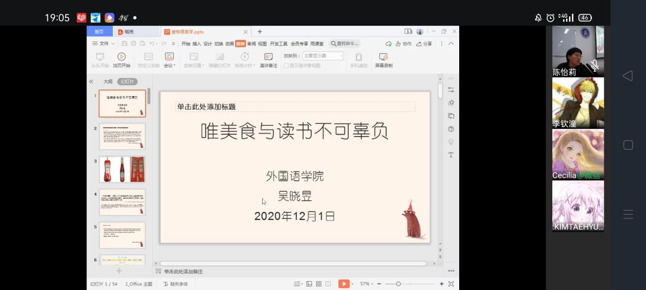 2020年 12月1日晚7:00,新葡的京集团35222vip于教学三号楼806室开展了“益”周读书系列读书会第三十讲。本次读书会主题为“唯美食与读书不可辜负”,采用“线上+线下”的方式举办,参与人数近120人,主讲人吴晓昱副教授为同学们分享了《食物语言学》。