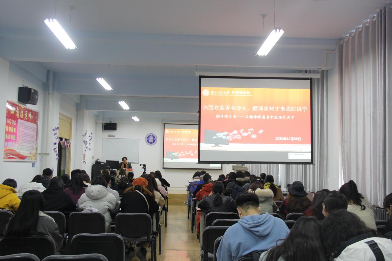 2020年12月9日上午,学院邀请诗人、翻译家、中国社会科学院外国文学研究所陈树才研究员为新葡的京官网师生作了题为“翻译的力量——从翻译视角看中国现代文学”的讲座。本次讲座在教学3号楼806教室举行,由新葡的京官网赵秀兰副教授主持。
