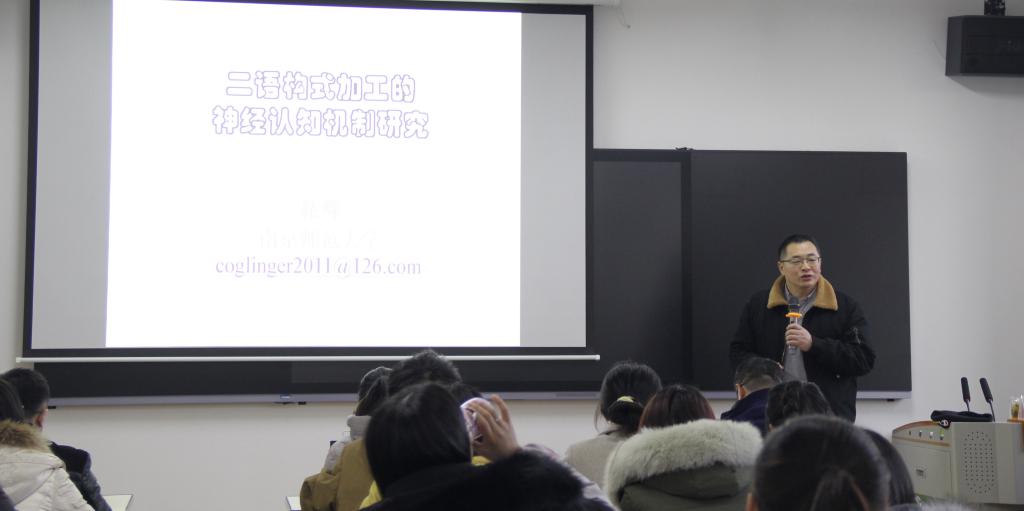 12月24日,张辉教授深入浅出地介绍了语言加工的神经认知机制研究。首先,张教授解释了认知语言学对构式的界定和神经认知机制研究的相关技术(ERP)。接着,张教授以二语学习者与母语者对语言加工是否存在差异,重点介绍了母语学习和二语习得的神经认知机制关系的理论假设、研究范式、典型语义违反标志性ERP成分、典型句法违反标志性ERP成分等内容,在宏观层面上建立起了母语学习和二语习得神经认知机制研究的基本概念。最后,张教授从构式语法的视角提出二语习得研究应当从语言单位的整体性出发,并以“way构式”作为研究个案详细介绍了该研究的被试选择、实验过程、数据解读、实验结果、实验讨论等实验步骤。