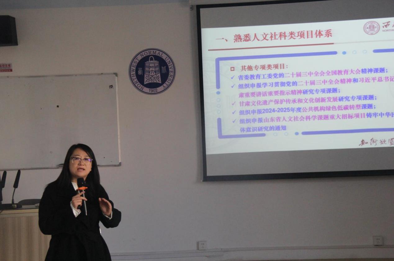 杨鑫教授结合自身研究与实践经验,系统梳理了国家社科基金、教育部项目及省市级项目等人文社科类项目体系,阐释了项目申报与成果培育之间的内在联系。她指出,选题应立足教师研究积累与学科优势,关注国家战略、区域需求及人工智能等跨学科前沿,建议教师聚焦方向、持续深耕,并通过多轮论证不断完善申报材料。杨教授还就最新科研政策与成果分类办法进行解读,并结合学校近年申报数据,鼓励教师积极把握教育部项目机遇,善用资源提升科研竞争力。