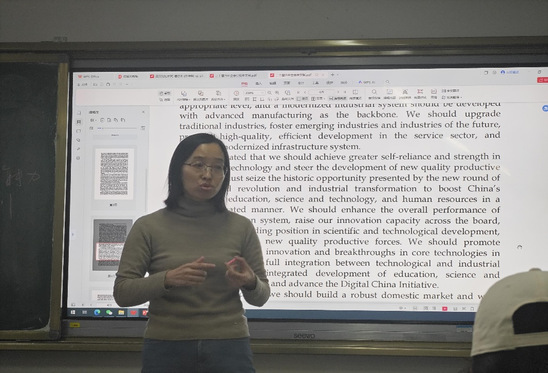 本次诵读活动继续围绕党的二十届四中全会公报展开学习。党老师以全会公报英文版为核心内容,聚焦国家政治用语翻译技巧与特殊句式结构解析两大重点,系统讲解了“中国式现代化”“高质量发展”“科技自立自强”等关键表述的英文译法,通过对比分析与长难句逻辑拆解,帮助同学们在专业学习中准确把握全会精神的核心要义。随后,同学们分组逐段研读公报英文文本,在朗朗书声中深化对原文的理解,并围绕翻译难点展开热烈讨论,交流不同语境下的译法选择与优化思路,实现了理论学习与专业能力的同步提升。