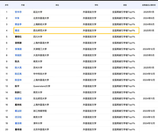 近日,“2025全国高被引学者”发布。新葡的京官网教师曹进教授成功入选外国语言文学高被引学者Top1%名单,靳琰教授、梁海英教授成功入选外国语言文学高被引学者Top5%名单。